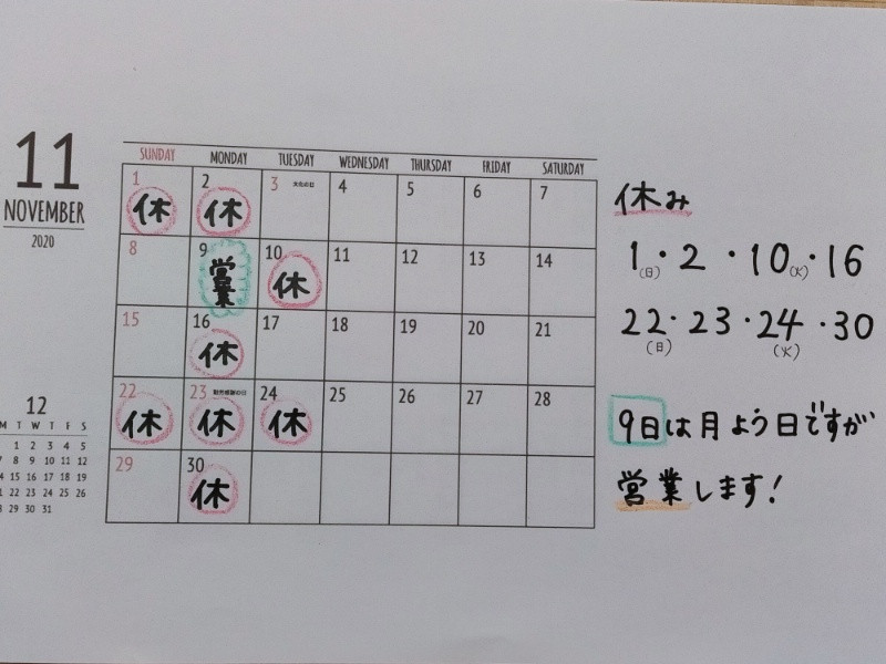 11月のお休み、ご案内。